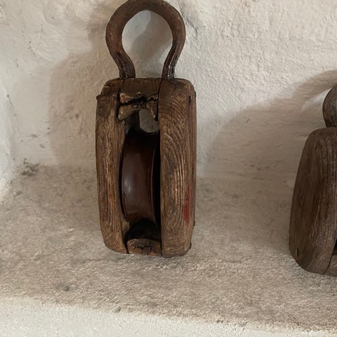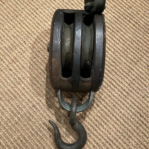 Bloktalje i træ med dobbelt skive og metalbeslag. Fin som dekoration eller til dig der kan bruge en solid gammel talje.