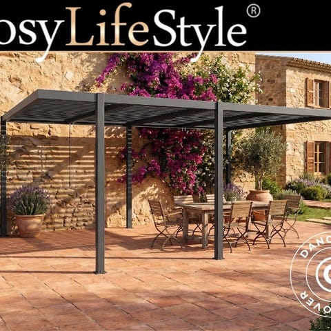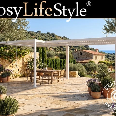 San Pablo er en moderne og elegant bioklimatisk pergola pavillon fremstillet i stærkt, vedligeholdelsesfrit pulverlakeret aluminium. De justerbare taglameller betjenes nemt med håndtag, så du kan regulere lysindfald, skygge og ventilation efter behov. Dette sæt indeholder to komplette San Pablo pergola pavilloner, som leveres med solide beslag, så de kan sammenkobles sikkert til én større konstruktion. Hver bioklimatisk pergola pavillon kan også anvendes separat. Sidevægge/skærme kan bestilles separat!
