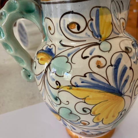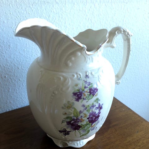 Flot hvid porcelænskande med blå blomstermønster på siden. Har låg, hank og lang tud, fin til bordet eller som pynt.