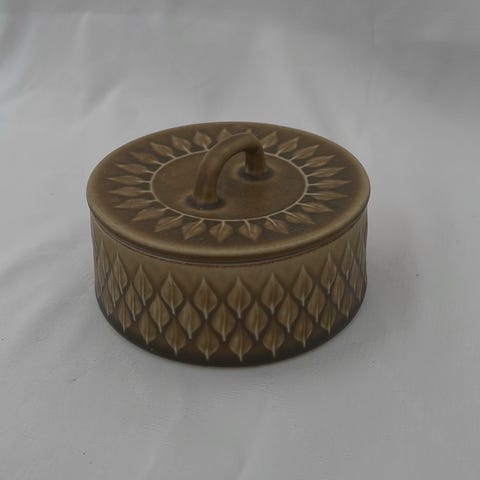 Fin brun stentøjs skål fra Bing & Grøndahl med låg og hank i begge sider. Indvendigt er den lys og har mønster både på låg og sider.