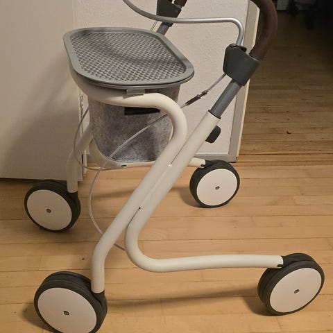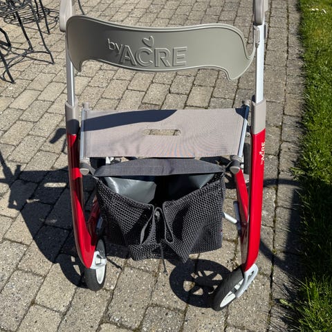 ByAcre Carbon Ultralight rollator i beige/grå med sæde og fire hjul. Har bøjlehåndtag og praktisk ramme, der er nem at komme rundt med indendørs og udendørs.