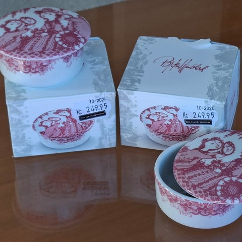 Sæt med 2 små hvide porcelænskopper fra Bjørn Wiinblad med blå mønster. De står i original papæske med ruminddeling til kopperne.