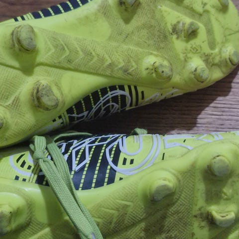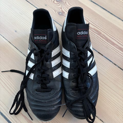 Adidas fodboldsk st 39.5i gul/sort med snørelukning. Har mønster på oversiden og klassiske striber på siden.
