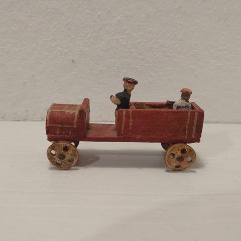 Miniature stigevogn og brandsprøjte i træ og med hjul af blik.