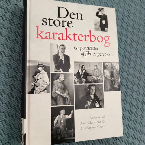 Bogen "Den store karakterbog – 151 portrætter af fiktive personer" med sort/hvid-fotos på forsiden. Stor hardback-udgave, fin som opslagsbog til inspiration til roller og figurer. Sender ikke for køb under 200 kr.