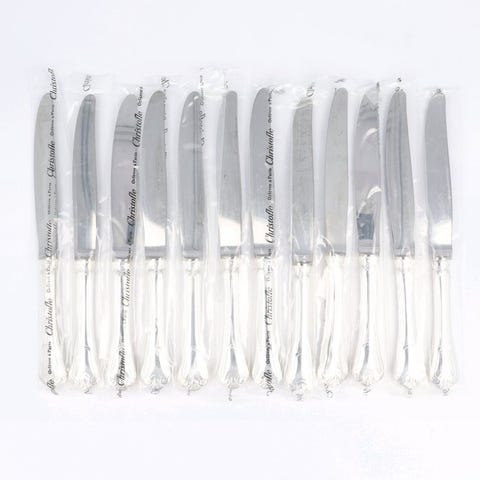 Beskrivelse: Flot sæt på 12 middagsknive, udført i Christofle-model America.