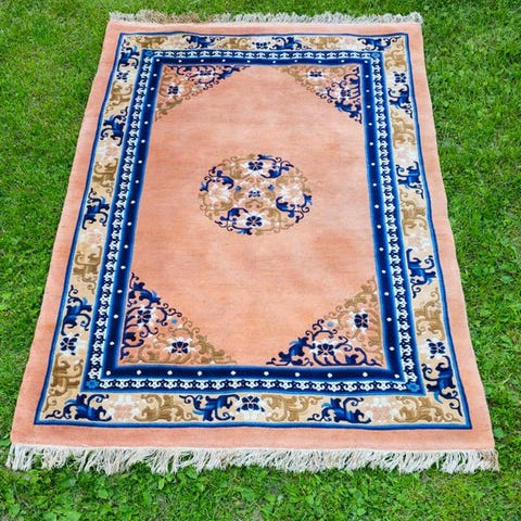 Vi præsenterer et elegant par kinesiske tæpper fra Pekin, oprindeligt vævet som sengemåtter. De udmærker sig ved deres raffinerede traditionelle kinesiske blomsterdesign med stiliserede peoner og geometriske læg omkring bløde elfenbens-, fersken- og jadeblå nuancer.