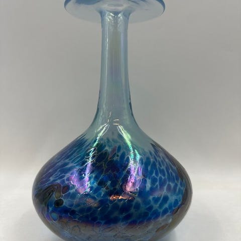 • Fremstillingen: Genstanden er fremstillet med den traditionelle teknik af glasvægge kaldet e2 cannee9 i lodrette rør. Dekoren veksler rytmisk mellem fascinerende blå kobolt og turkise striber, prydet med lyse aventurin-linjer (en ædel glasmasse beriget med kobberkrystaller, der skaber indtrækkende metalliske