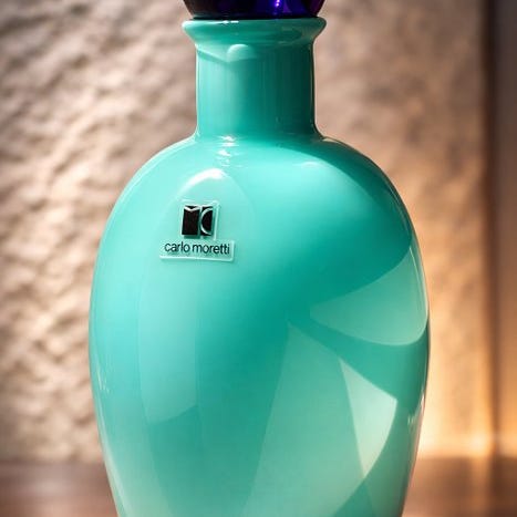 Hvert stykke er individuelt signeret af Carlo Moretti (graveret i bunden) og de fleste bevarer deres originale klæbemærke, der bekræfter ægthed og oprindelse. Sættet er lavet af kvalitets Murano mund-blæst og håndfinishet glas, kendt for sin overlegen klarhed (refraktionsindeks 1.518, tæthed 2.53) og luksuriøs