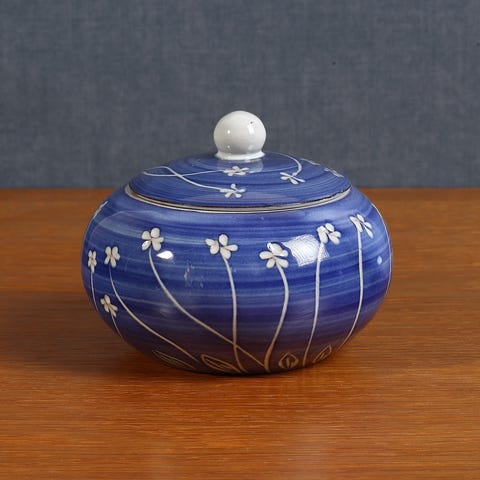 Makkum keramikkrukke med låg, håndmalet med blomsterdekoration i blå nuancer, dateret 2005, højde 18,5 cm, bredde 18,5 cm, dybde 18,5 cm, vægt 1116 g, cremefarvet bund, mærket og indgraveret med navn og dato. Klik på den blå "gå til varen" knap, for at købe eller byde på denne vare. Den samlede pris vil blive vist inden du afgiver dit bud.