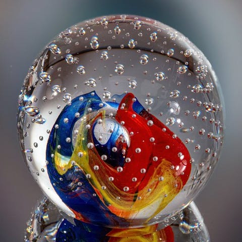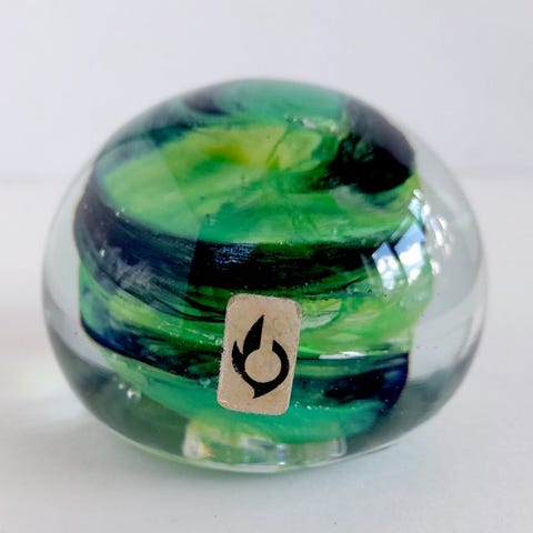 Kugleform. I midten af brevvægtens top ses en stor luftperle, som omgives af en virvel af bånd i pink-, blå- og ravfarvede nuancer samt flere luftperler. Konstruktionen minder om et foto af Hubble-rumteleskopet af en spiralnebel. Vidunderligt farvespil og smukke optiske