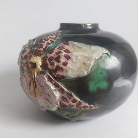 Den tætte sammenhæng mellem vase, farve og tegning udgør samlet en overbevisende enhed.