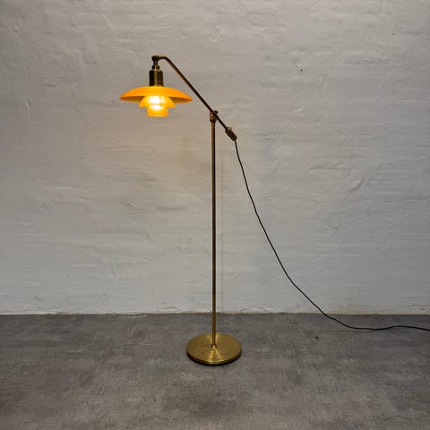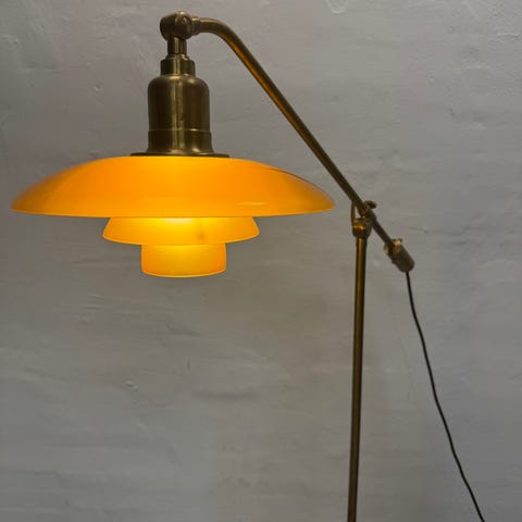 Ikonisk Poul Henningsen lampe, udført i massiv messing med eksklusivt skærmsæt i ravfarvet glas, der giver et varmt og behageligt lys.