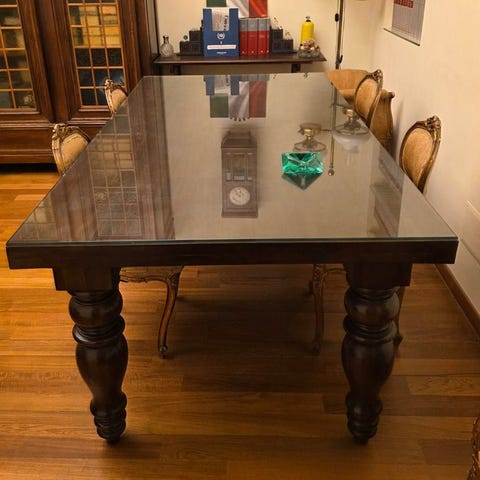 Dimensionerne på det massivt kirsebærtræ harp-tafelt er 72 × 57 × 36 cm. Det er ikke beskadiget, har ikke gennemgået restaureringer og er ikke ændret. Det er et kompakt bord uden bevægelige forbindelser.
