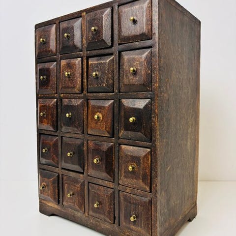Gamle, forkortede og ombyggede industrielle skabe til et lille sidebord, små træafsnit eller opdelinger lavet i hvert skab. Et unikt stykke med en praktisk størrelse til at passe ind i en indretning og en utrolig patina.
