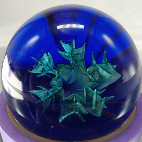 Et tidligt papirvægt fra Isle of Wight Studio Glass fra 1970’erne af Michael Harris, i klart glas med en levende grøn indre Sno, og bevaret original etikette og indgraveret Isle of Wight-logo ved pontil. Klik på den blå "gå til varen" knap, for at købe eller byde på denne vare. Den samlede pris vil blive vist inden du afgiver dit bud.