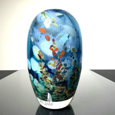 Smuk vase i originalt mundblæst glas. Smukt arbejde med glas og farver. Den er 24 cm høj og 12 cm bred. Den er i fremragende stand. Jeg kender ikke oprindelsen eller den nøjagtige alder.