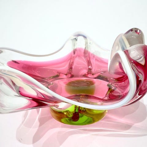 Murano-gjærdglasaskebærer fra Italien, dateret til midten af det 20. århundrede (1950–1975), ca. 13 cm bred, 13 cm dyb og 5,5 cm høj, 574 g tung, i en organisk muschelform med sølvpartikelmønster og pink nuancer ved kanten. Klik på den blå "gå til varen" knap, for at købe eller byde på denne vare. Den samlede pris vil blive vist inden du afgiver dit bud.