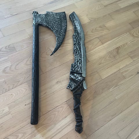 Epic Armoury latex spray til vedligeholdelse af rollespilsvåben. God til sværd, økser og knive med latexbelægning, så de holder sig pæne længere. 3 sværd , 2 knive, samt 1 økse.
