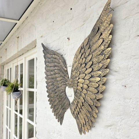 Par af metaliske englevinger til jul, af stål, gyldne, estimeret periode 2010–2020, hver 100 cm høj, 30 cm bred og 2 cm dyb, i fremragende stand. Klik på den blå "gå til varen" knap, for at købe eller byde på denne vare. Den samlede pris vil blive vist inden du afgiver dit bud.