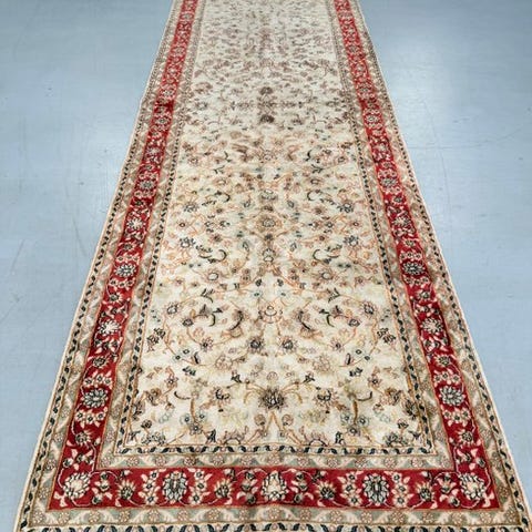 Dette stykke skiller sig ud ved sit klassiske Agra-blomsterdesign, med et centralt felt i bløde cremefarvede nuancer og en kant i rød dekoreret med traditionelle blomster-motiver, hvilket skaber en harmonisk og elegant sammensætning. Det er en ideel tæppe til gange, indgange eller trange rum.