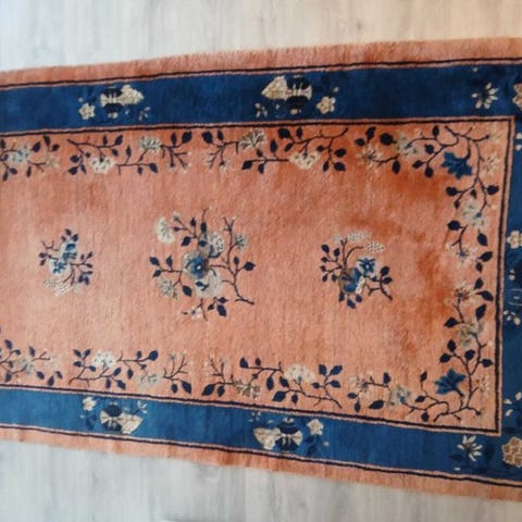 Oprindelse: Kina; Model: Art Deco; Håndknyttet uld på bomuld, målene 166 × 262 cm, dateret 1940–1950, i generelt god strukturel tilstand med mindre pletter på frynser og underbeskyttelsen. Klik på den blå "gå til varen" knap, for at købe eller byde på denne vare. Den samlede pris vil blive vist inden du afgiver dit bud.