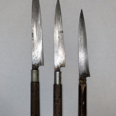 RARE Set of 3 Japanese Yanagiba Knives – Sakai Ichimonji Tadakuni + Kiyomitsu + Shigemitsu – Signed Vintage Blades