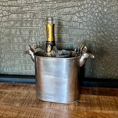 Stor nikkelbelagt skål i oval form til champagne- eller vinglas med indgraveret tekst fra Lily Bollinger og Napoleon Bonaparte på to sider.