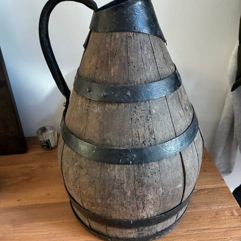 Tre fantastiske gamle kander fra begyndelsen af århundredet. Man kan se det i håndtagets udformning med det indlagte træ; den mindste kande mangler Bundringen. Ellers i god stand samlet set.