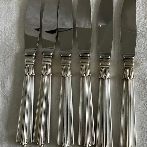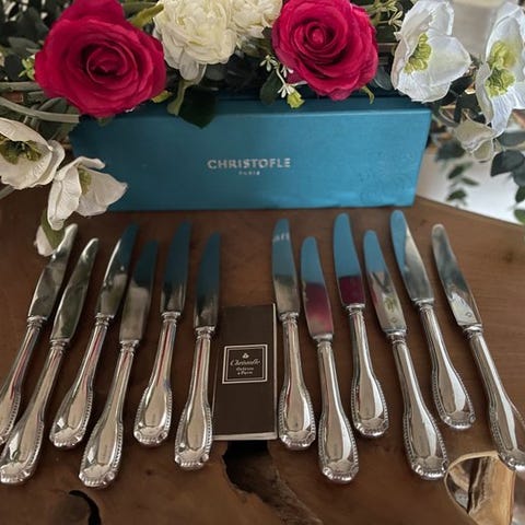 Et sæt på 12 spiseknive fra Christofle, modellen Coquille Vendôme Arcantia i sølvelagt metal.