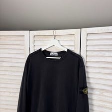 Sort Stone Island striktrøje i alpakauld i str S med rund hals. Klassisk model med ribkant ved hals, ærmer og bund samt det velkendte logo på ærmet.