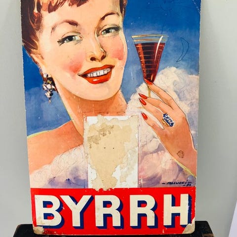 BYRRH reklameplakat fra Frankrig, cirka 1950–1960, lavet af karton, 37 cm høj og 26 cm bred, i rimelig stand med mulig manglende små dele, originalt/officiel. Klik på den blå "gå til varen" knap, for at købe eller byde på denne vare. Den samlede pris vil blive vist inden du afgiver dit bud.