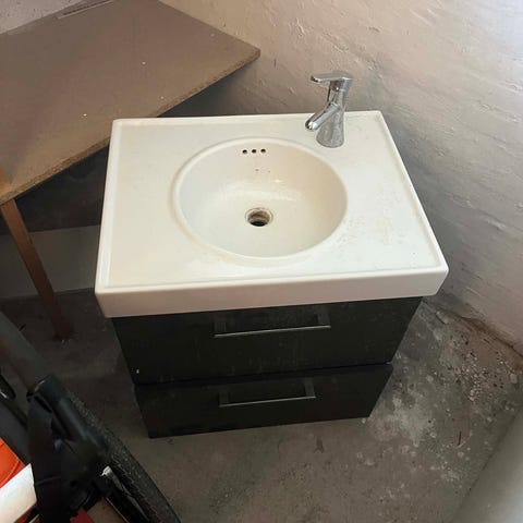 IKEA HAVBÄCK skab til vask med to skuffer i hvid, 80x48x63 cm. Skabet har indvendige rumdelere i trælook og udskæring i toppen til afløb/armatur.