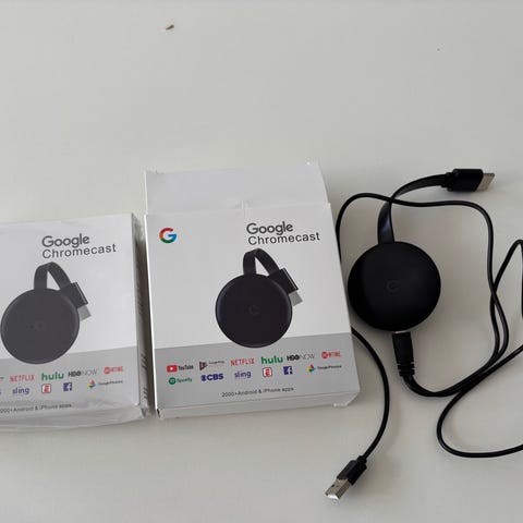 Google Chromecast streaming-enhed med HDMI-stik. Sort rund model, klar til at blive sat direkte i TV’ets HDMI-port.