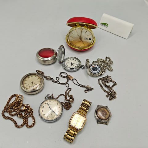 Diverse lommeure og tilbehør samt dele og kæder, nogle kan køre, stil ingen spørgsmål om delene da det ikke er noget jeg har forstand på, kontakt på 40607500