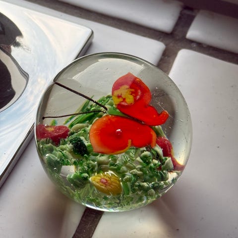 Tre runde papirvægte med indstøbte gule blomster og planter. Fine som pynt på skrivebord eller hylde.