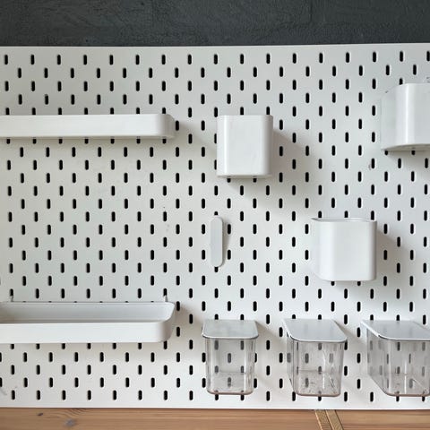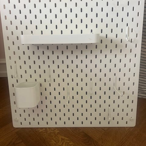 Denne model er udført i hvid plast med integrerede beholdere og kroge i forskellige størrelser, ideel til organisering af kontorartikler, køkkenredskaber, værktøj eller accessories. Perfekt til både hjemmet, kontoret eller butiksindretning. også perfekt til børneværelset eller teenage værelset , eller kreaværelset. kreaopbevaring