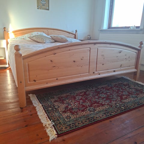 Dobbeltseng i massivt fyrretræ med buet gavl. Klassisk trælook - super cool og med flotte detaljer. Til madras på 180x200.