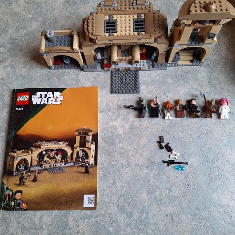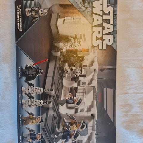 LEGO Star Wars byggesæt med flere minifigurer og detaljeret base. Der er mange små dele og figurer, som kan stilles op på forskellige måder. Kassen har et lille tryk i nederste venstre hjørne