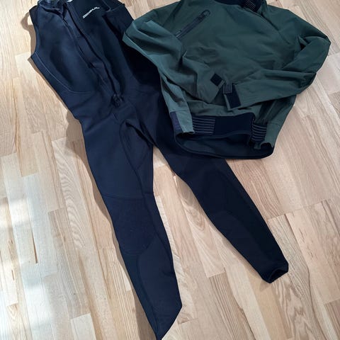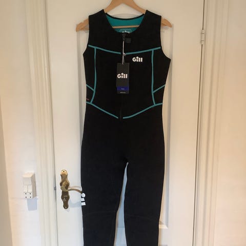 Dame Neopren våddragt i str L med lange ben og lynlås foran. Med blå overjakke med justerbar talje og lynlåslomme på brystet. Kun brugt en kort sæson.