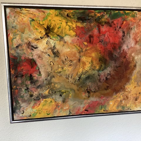 Abstrakt maleri i røde, gule og mørke nuancer i firkantet format. Sidder i en enkel ramme, klar til at hænge op på væggen. 60-60 cm. Sender.