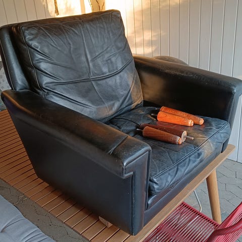 Sofagruppe, brunt læder, man sidder godt i det, kan bruges til garage, rytterstue ,kolonihaven el lign. Katten har revet i det flere steder, derfor prisen