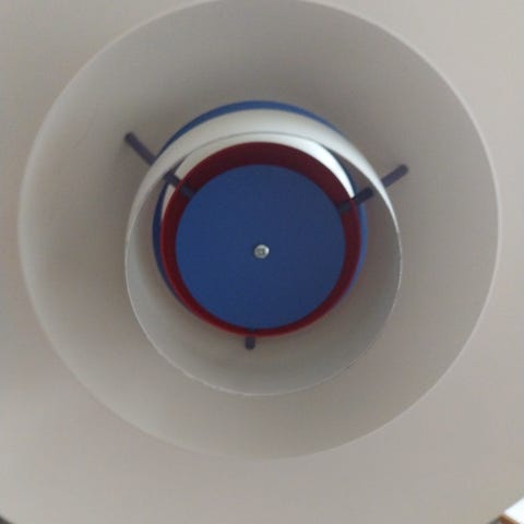 PH loftlampe fra Louis Poulsen designet af Poul Henningsen i hvid med blå og rød inderskærm. Hænger i ledning fra loftet og giver et blødt, nedadrettet lys.