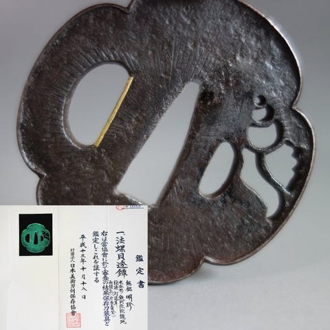 Tsuba - Japan, Edo-periode (1600-1868), jern, Kasane mochi-gata form (riskage form), design: Chrysanthemum (Kiku) med 24 blade samt blomsterudsmykning i henholdsvis guld nunome (front) og sølv nunome (bagside). Meget flot og præcist udført kvalitetsarbejde. Tanto (kniv) størrelse, højde 66 mm x bredde 54 mm.