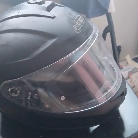 Sort hjelm med klart visir og ventilationsåbninger. Har enkle brugs ridser, men ikke noget af betydning.