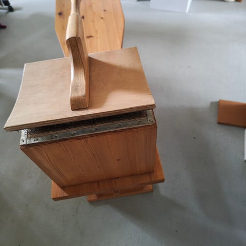 udskårne træhylder, lille skab, manglebrædder.