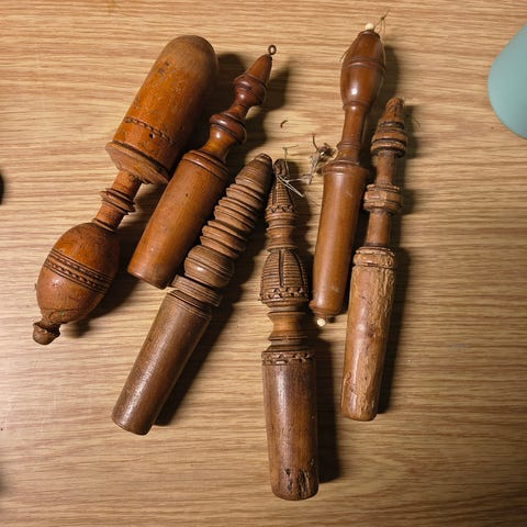Samling af forskellige udskårne træhylder og et lille skab i træ, manglebrædder, serviet holder. Flere af delene har flotte mønstre og kan hænges op på væggen.
