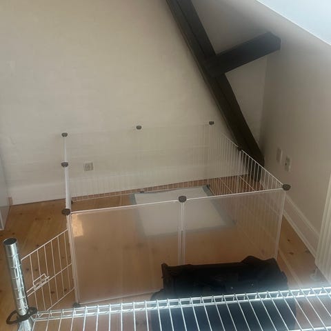 Sort metal hvalpegård til små og mellem stor hunde. Med netvægge hele vejen rundt. Har låge med lukkeanordning i siden og er fleksibel og kan stilles op forskellige, som på billederne.