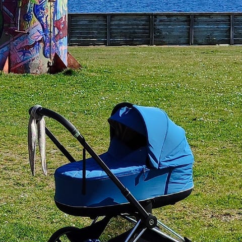 OBS. Dækkenet mangler desværre. Måske liften kun bruges her til sommer, hvor det alligevel er for varmt for baby med dækken.
