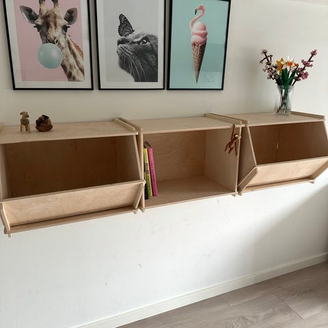 Mærket er Pixiform legetøjsreol i lyst træ med tre rum til opbevaring. Står på hjul, så den er nem at rulle rundt.